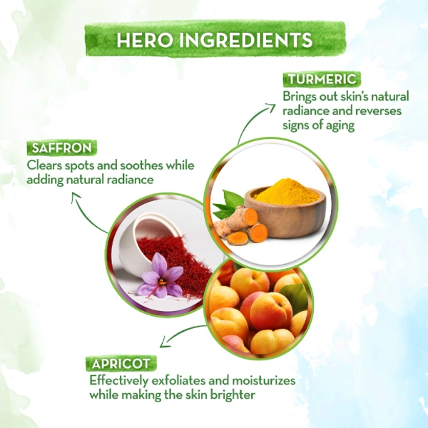 Indulge in the age-old tradition of Ubtan and let it rejuvenate your face for a fresh, bright, flawless look. The goodness of Ubtan comprises Turmeric and Saffron – both ingredients that are revered for their benefits in imparting glowing skin and tan removal. Saffron clears spots and helps in tan removal, while the antioxidant properties of turmeric protect the skin cells from free radical damage while keeping it healthy. Apricot Oil and Cucumber present in the Ubtan Face Mask help exfoliate, soothe and reduce tan for a glowing look.